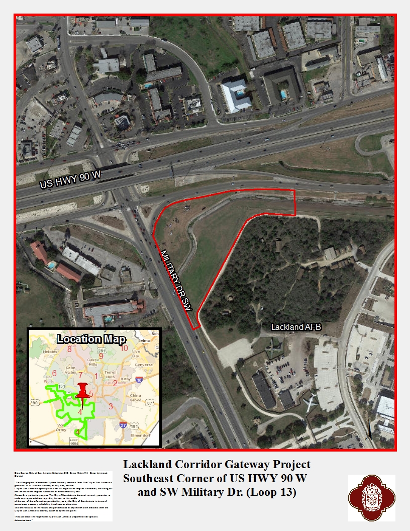 The Lackland Corridor Gateway Project was identified through the Lackland Corridor Streetscape Master Plan which was approved by City Council in August 2014. The Master Plan identified multiple phases of improvements that could be constructed in order to convey the distinct area which is home to the United States Air Force's basic training program. With hundreds of Airmen and Airwomen graduating each week, family and visitors from around the United States travel through the Lackland Corridor. The intersection of U.S Highway 90 and Loop 13 (SW Military Drive) has been identified as the most visible location along the corridor for what will be called the gateway into the military installation.